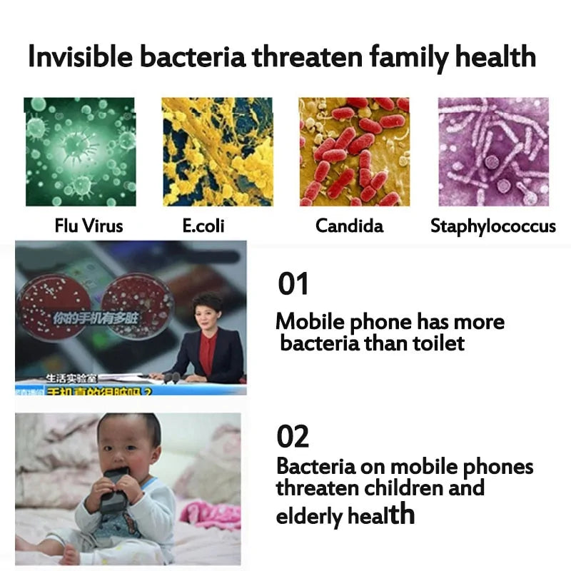 Effortlessly sanitize your belongings with UV-C light technology that effectively eliminates up to 99.9% of bacteria and viruses.